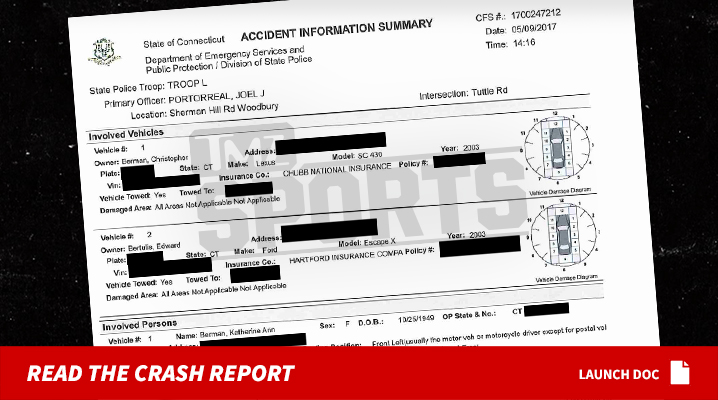 According to the police report obtained by TMZ Sports, 67-year-old Katherine Berman was driving her 2003 Lexus around 2:15 PM when she slammed into the back of a Ford Escape.